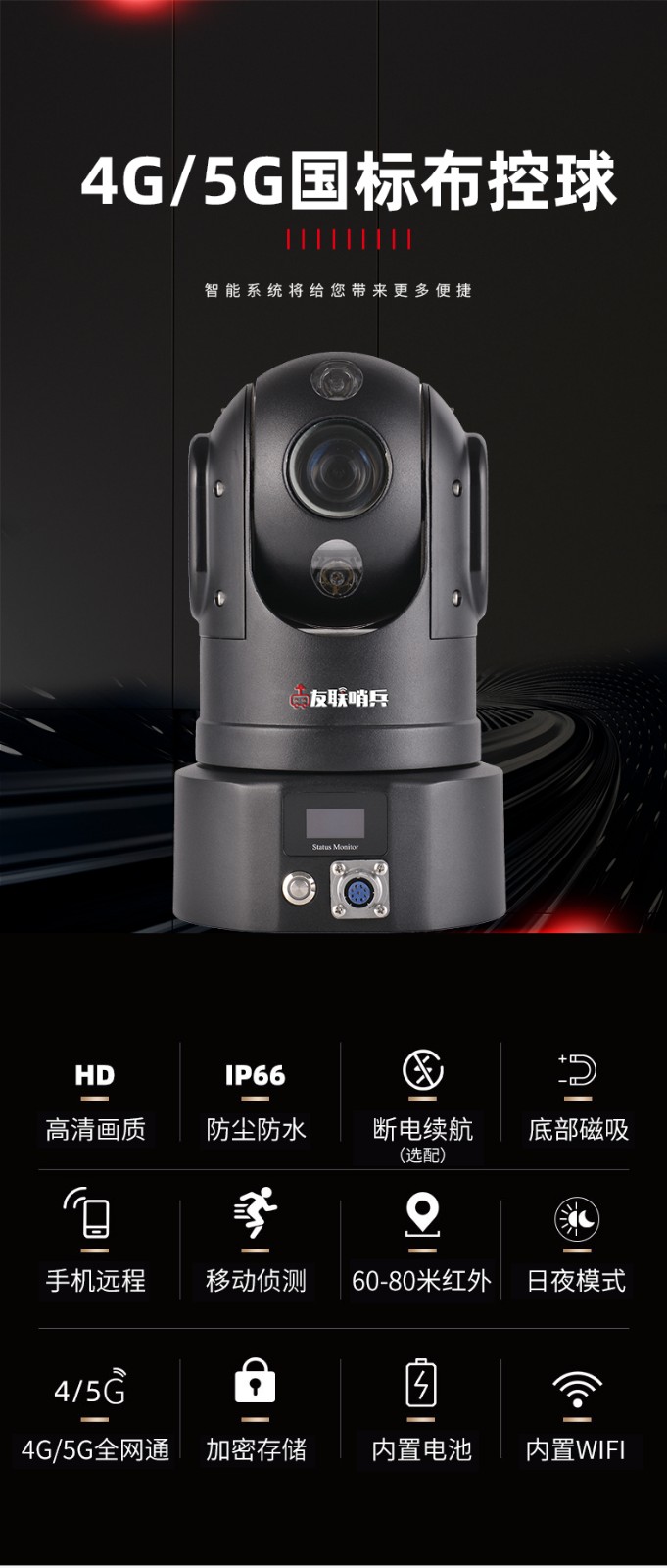 友聯(lián)哨兵4G雙卡智能高清布控球(云臺(tái)),是集高清晰攝像、無線圖傳、雙向?qū)χv、實(shí)時(shí)定位、遠(yuǎn)程回放、云臺(tái)操作等多功能于一體的便攜式4G應(yīng)急布控球產(chǎn)品,超高設(shè)備集成度,內(nèi)置高性能鋰電池組,具備防水防震的特性,底座帶有強(qiáng)磁鐵吸盤,可快速架設(shè)于三角支架或車頂?shù)?,滿足應(yīng)急布控及快速安裝的特殊要求。廣泛適用于外勤執(zhí)法、偵查布控、安防安保、應(yīng)急指揮、搶險(xiǎn)搶修、巡線管理等行業(yè)應(yīng)用,如公安、交警、消防、路政、城管、交通、法院、監(jiān)獄、林業(yè)、電力、水利、環(huán)保等單位。