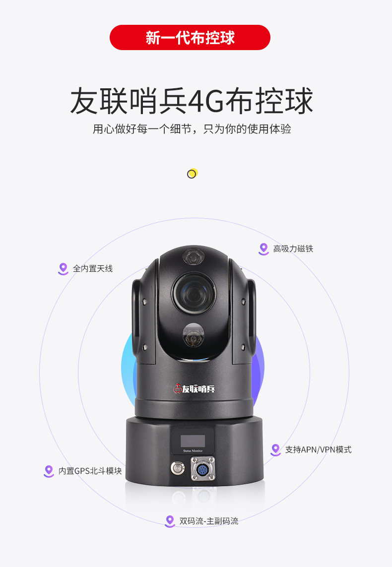 友聯(lián)哨兵4G高清布控球是一款功能全面、攜帶方便的無線視頻4G應急布控球產(chǎn)品,超高設(shè)備集成度,內(nèi)置高性能鋰電池組,具備防水防震的特性,可滿足臨時布控和快速安裝的特殊要求。