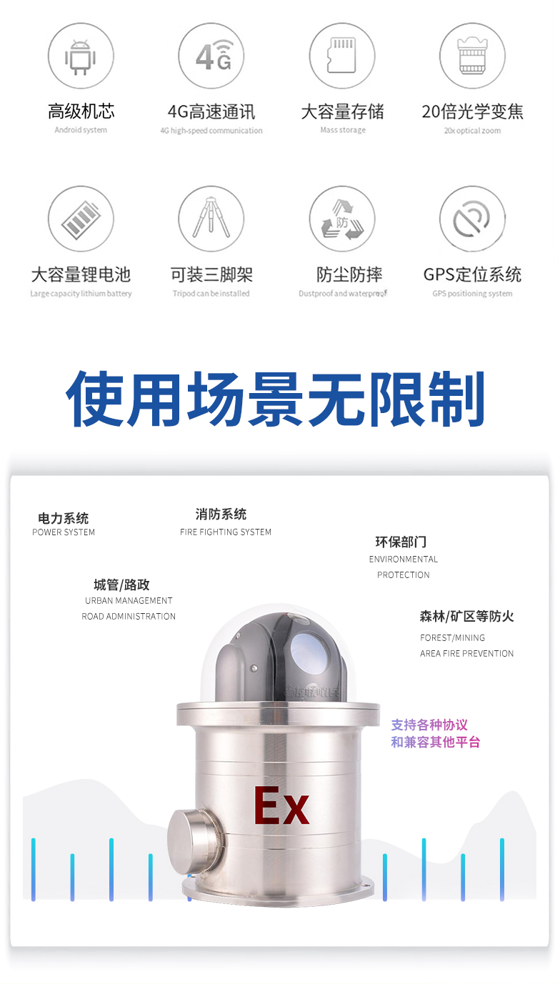 友聯(lián)哨兵5G防爆布控球是一款具備防爆功能的5G布控球產品,專為特定行業(yè)(如石油、煉化、化工、燃氣等危險化學和易燃易爆行業(yè))設計。產品內置高清攝像機及高性能鋰電池組,通過5G等無線網絡方式回傳至控制終端,具備防水防震防爆等特性,攜帶便捷,可快速安裝和收納,完全滿足石油、化工等作業(yè)區(qū)的移動巡檢、無人值守、臨時監(jiān)控、應急指揮的應用需求。